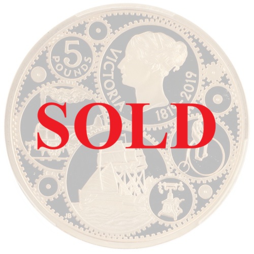 表面には若きヴィクトリア女王の周りに機関車や蒸気船などがあり、まさに朝時代の革新に囲まれ、進歩・変化・進歩を象徴している繊細なデザインとなっております。