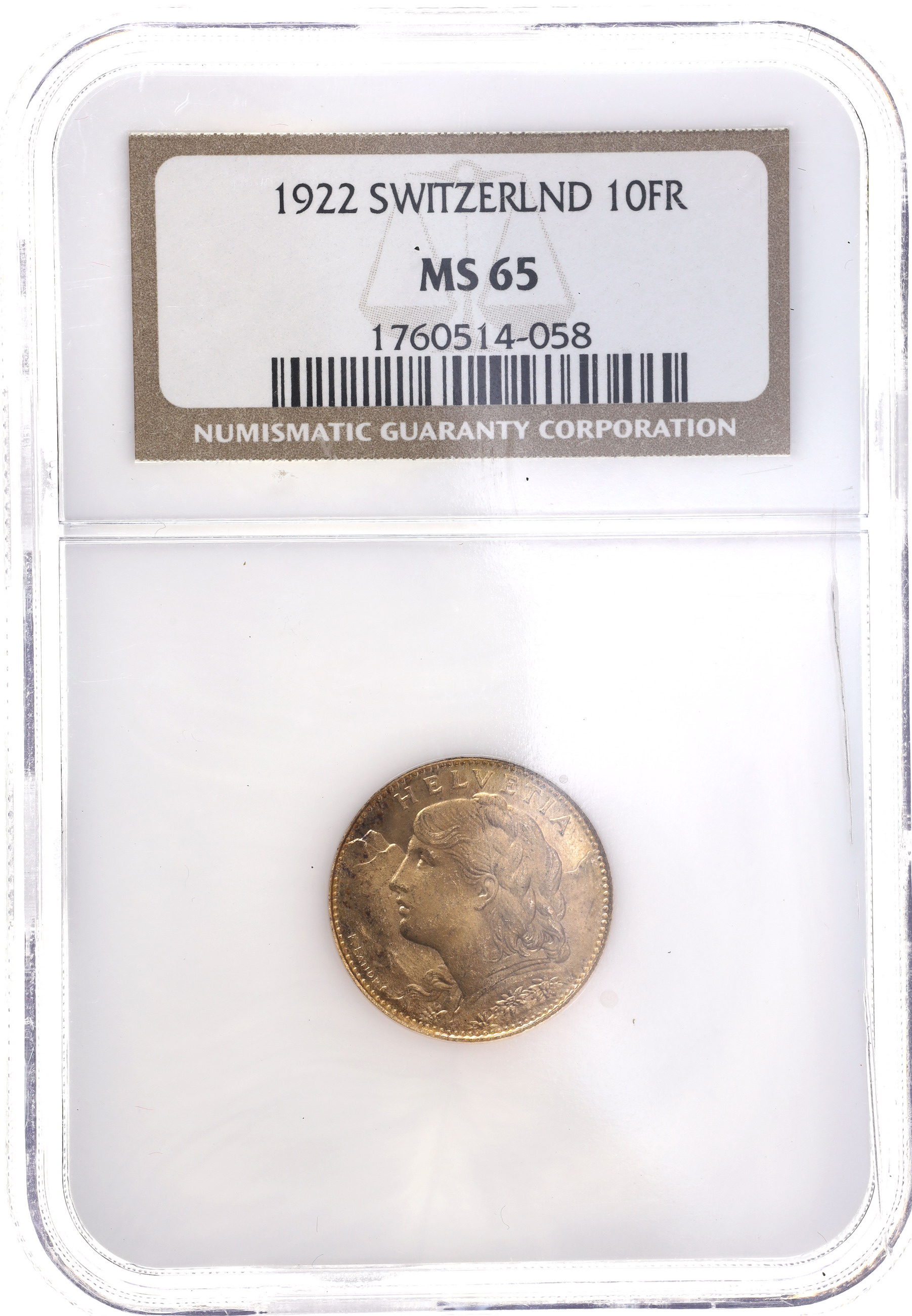 スイス 1922年B 10フラン金貨 アルプスと少女 ブレネリ ヘルベティア ベルンミントNGC MS65 のご紹介です。
