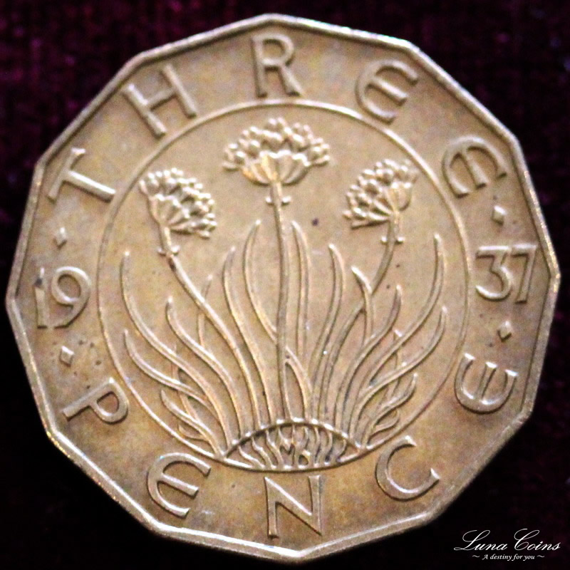イギリス1937年銘 エドワード8世3ペンスパターン貨幣(真鍮合金製、一般流通型)Spink 4064B |