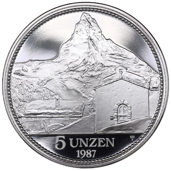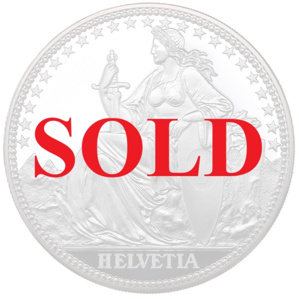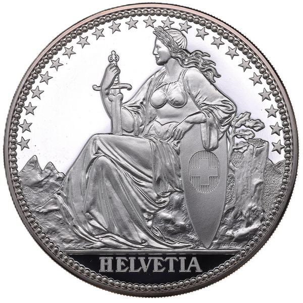 1987年に発行されたスイスの5オンス純銀メダル。勇壮かつ美麗織りなすヘルヴェティアのプロフィール座像が印象的です。