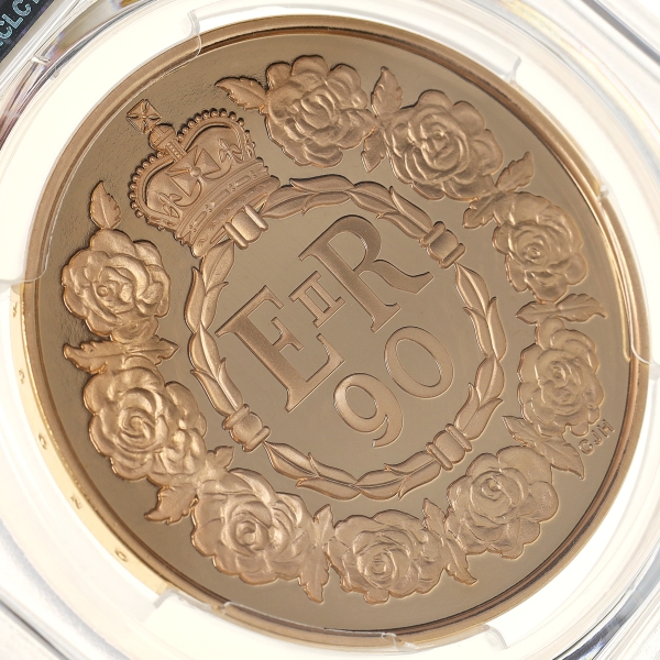 裏面には、女王のイニシャル E II R(Elizabeth II Regina) と「90」歳の数字を中心に、イングリッシュローズの花輪が優雅に囲みます。上部には王冠が配され、国家と君主制の伝統美を感じさせる華やかなレリーフです。