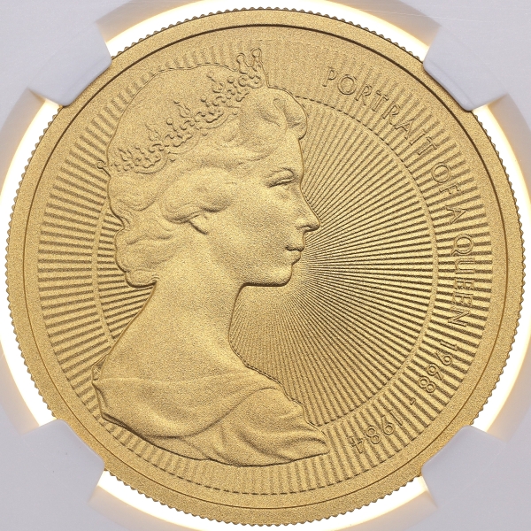 裏面にはゴードン・サマーズ作の、エリザベス2世第二肖像。いわゆる「ヤングエリザベス」の通称を持つ、若き女王時代の人気のレリーフです。特に1980~1984までの5ポンド(5ソブリン)金貨での人気は絶大です。